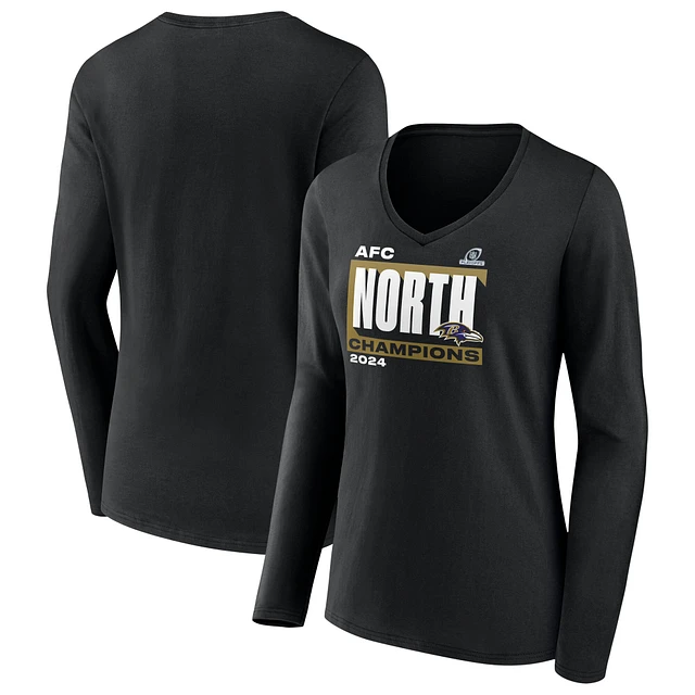 Women's Fanatics Black Baltimore Ravens 2024 AFC North Division Champions Conquer Long Sleeve V-Neck T-Shirt