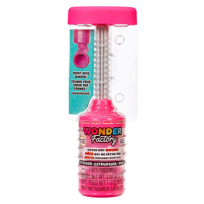 Introducing Wonder Factory Never Dry Dough Extruder! This extruder features our gluten free dough that stays soft and smells great for hours and hours of imaginative play. Use your extruder tool to transform your dough and twist out cool designs. With so many colors to choose from, there are endless possibilities of fun! Colors and styles may vary.