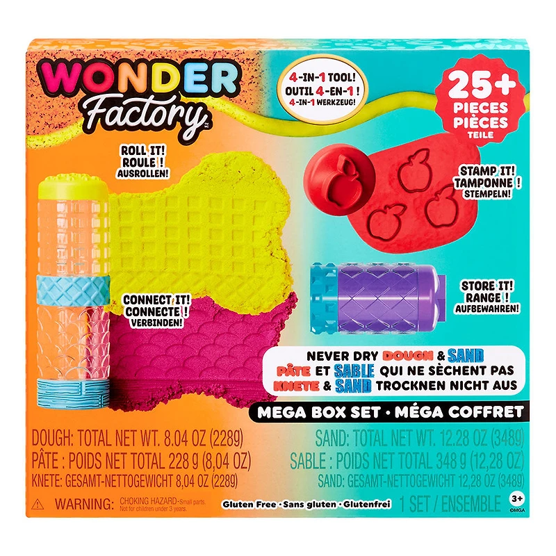 Features our unique Wonder Factory Dough and Sand - Never Dries Out, Gluten Free, and Smells Great!