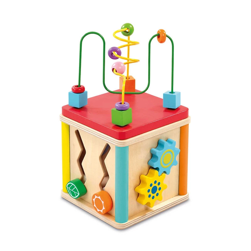 R Exclusive, only available at Toys R Us Canada. The Woodlets are incredibly busy with so many different activities to discover when playing with the Woodlets 5 in 1 Activity Cube.Can you help them tell the time, sort and post the shapes through the correct window, turn the cogs and solve the bead runner and maze? This 5-in-1 Activity cube includes 3 shape sorting blocks, spinning cogs, clock face and a bead maze lid that folds into the cube for tidy storing.This sturdy and colorful 5.5" x 5.5" cube is perfect for helping little ones develop fine motor skills, problem solving, color and shape recognition. Product features:
