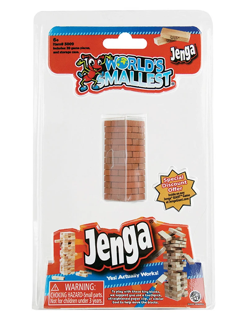 Jenga, the original wood block game that families have loved for generations is now available in the world's smallest size, measuring less than 2.5 inches tall! Stack It, Pack It and Go! Pull out a block, place it on top, but don't let the tower fall; This fun, easy to learn, challenging game is a great game for families and kids 6 and up. Enjoy single or multi-player, competitive play. Tip: use a toothpick, straightened paper clip or pencil tip to help move the tiny blocks. This classic miniature Jenga game is less than 2.5 inches tall and includes 39 mini blocks. All pieces fit inside the pocket-sized case, making for easy storage and take everywhere fun! A perfect Easter gift, party favor, stocking stuffer and more!