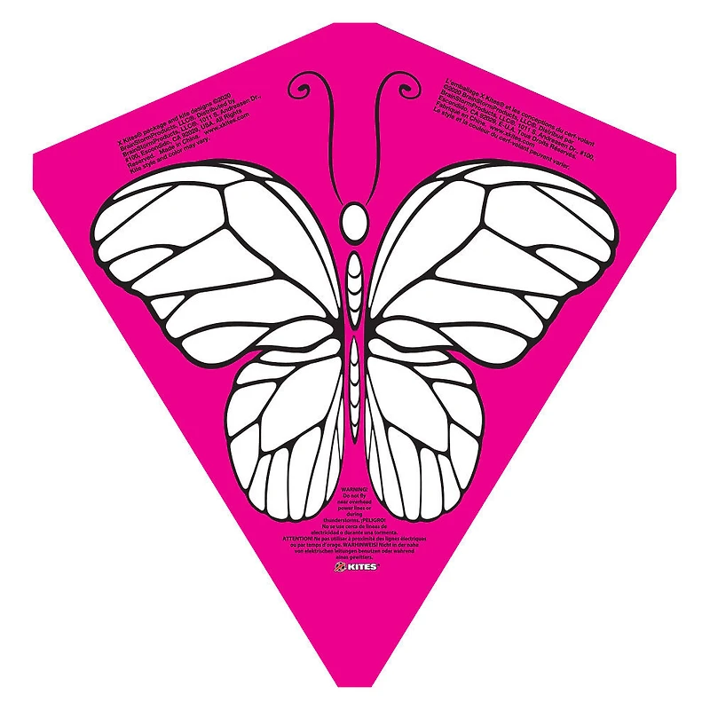 X Kites Poly Butterfly Color-Me-Kite is a traditional diamond shaped kite with a twist. Customize your kite with Dry Erase Markers (Blue, Yellow, Purple and Red). Other styles in the assortment include Toucan, Shark and T Rex. Color-Me-Kite is easy to assemble and to fly. Includes handle and flying line with QuikClip. With our QuikClip, there is no need to tie a knot.