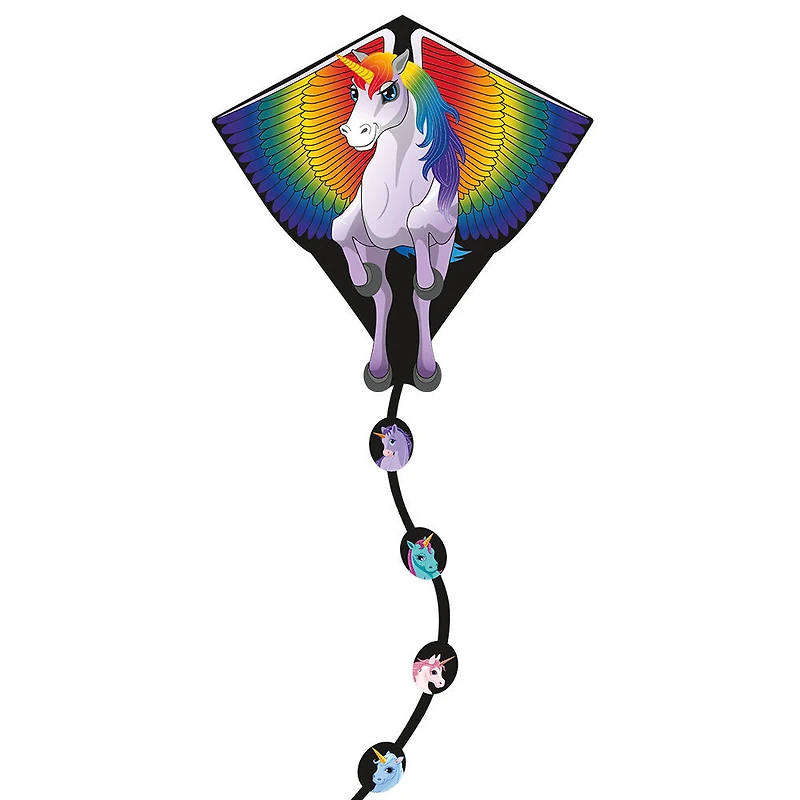 X Kites Dlx Diamond Unicorn Kite by BrainStormProducts is a diamond shaped nylon kite with fringed trailing edges.