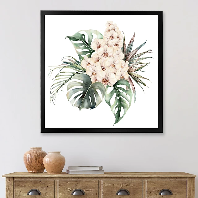 Bouquet with Orchids Monstera and Coconut Leaves Canvas Wall Art Print
