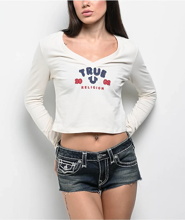 True Religion Applique Winter White Long Sleeve Crop T-Shirt