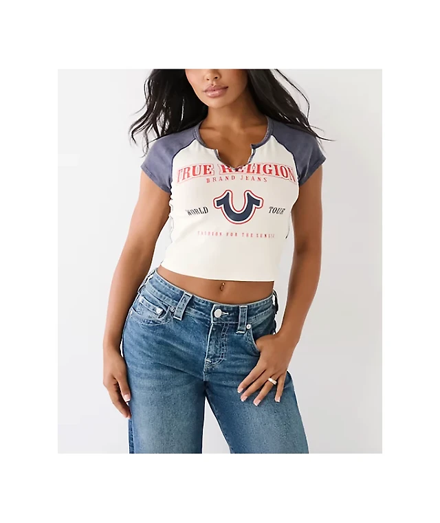 True Religion Logo Notch Winter White & Navy Raglan Crop T-Shirt