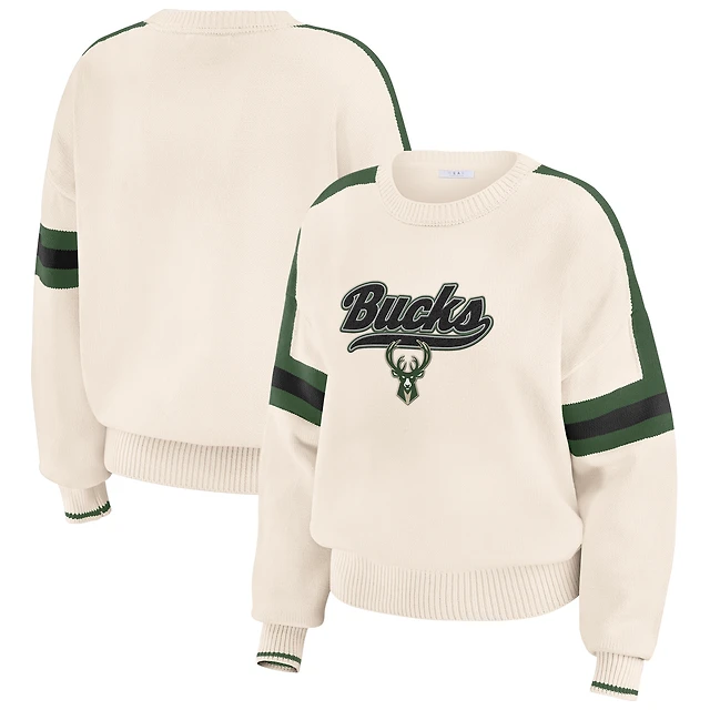 Women's WEAR by Erin Andrews Cream Milwaukee Bucks Stripe Pullover Sweater