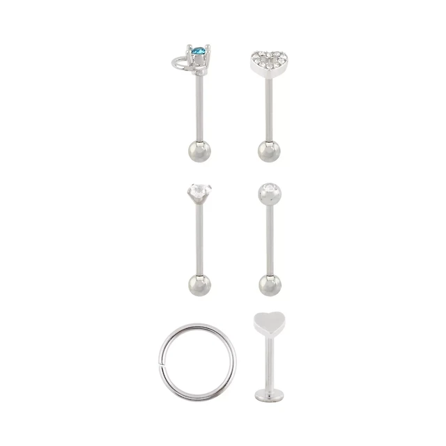 Multi-Pack Clear and Blue CZ Heart Silver-Tone Cartilage Pins and Hoop 6 Pack - 16 Gauge
