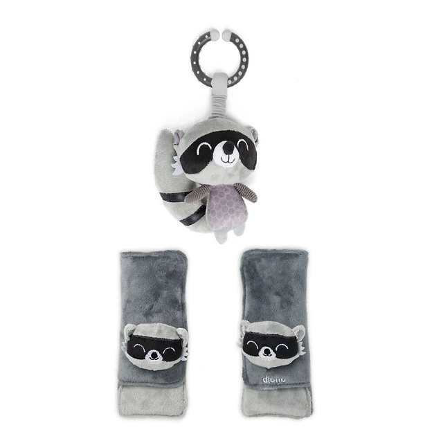 Diono Racoon Character Car Seat Straps & Linkee Toy, Shoulder Pads for Baby, Infant, Toddler, 2 Pack Reversible Soft Seat Belt Cushion and Stroller Harness Covers Helps Prevent Strap irritation