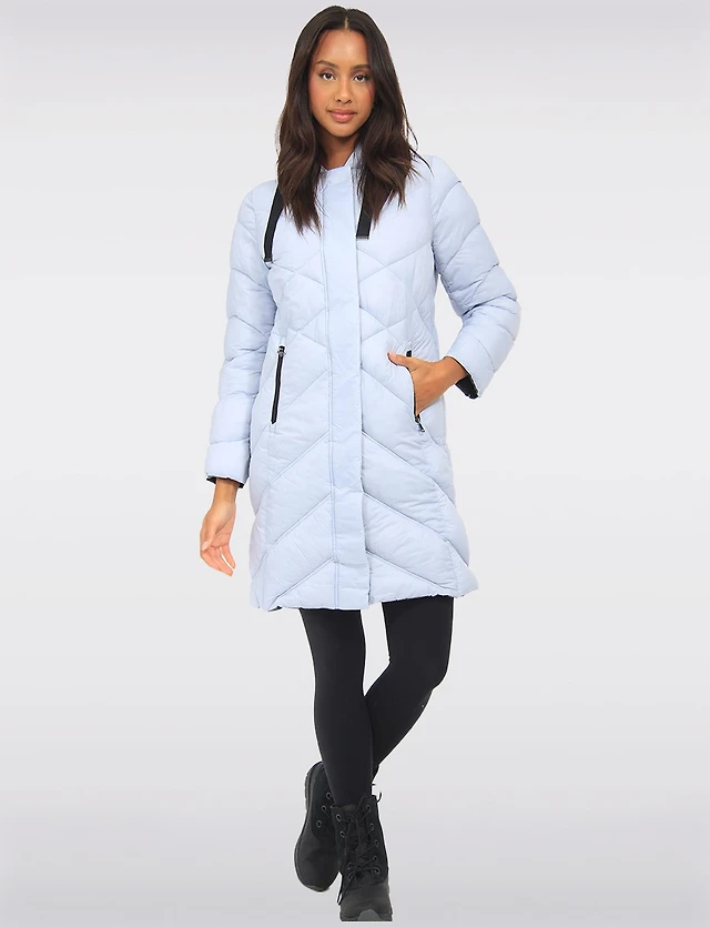 Dual Quilted Fitted Long Down Zip Front Detachable Hood Puffer Jacket by Sicily